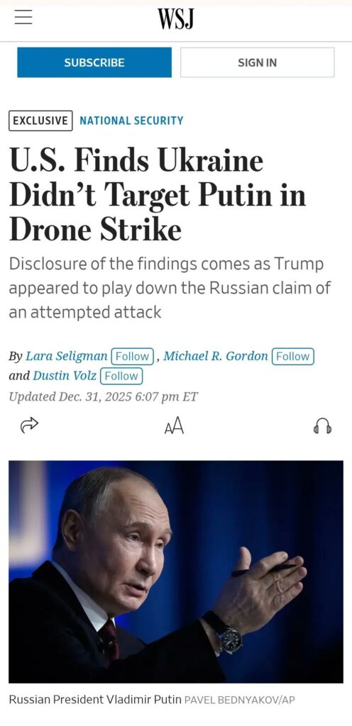 Директор ЦРУ Рэтклифф сообщил о выводах разведки Трампу,который затем опубликовал в своей соцсети ссылку на статью NYP, где говорилось, что Украина не наносила удар по резиденции путина, и сопроводил её заголовком статьи «Громкие заявления путина о „нападении“ показывают, что именно Россия препятствует миру».